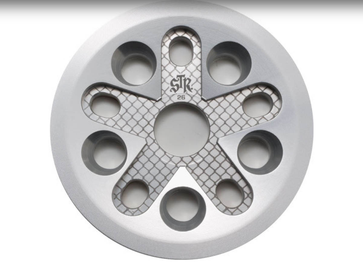 Coroa de BMX MOB STR V2 26D polida, em alumínio 100% usinado, c/ design único e protetor.