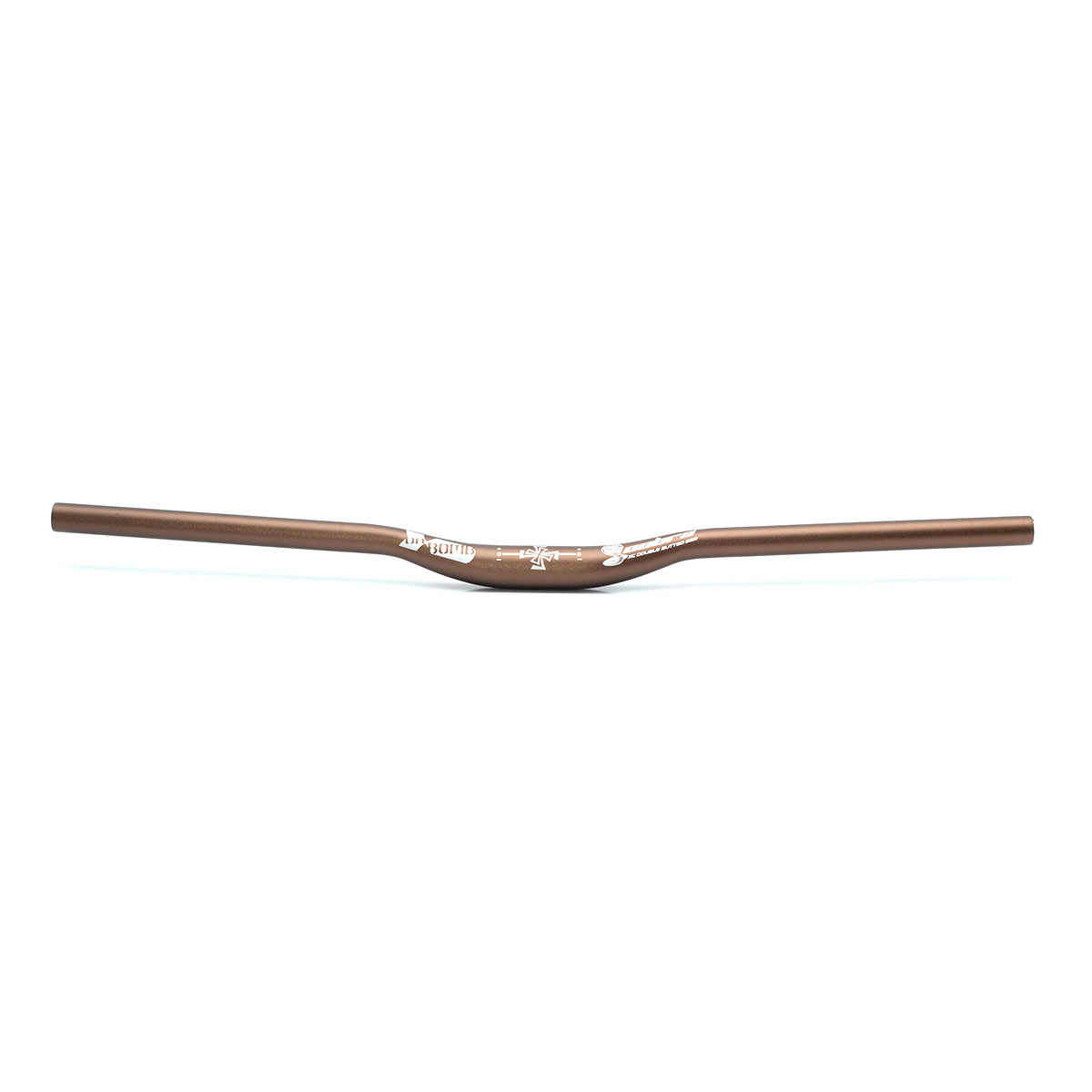 Guidão Da Bomb Cobra marrom, 710mm de largura, em alumínio 6061 T6, espessura variável, 5º de elevação, 4º de curvatura traseira, elevação de 20mm, indicado para XC e Trail bike.