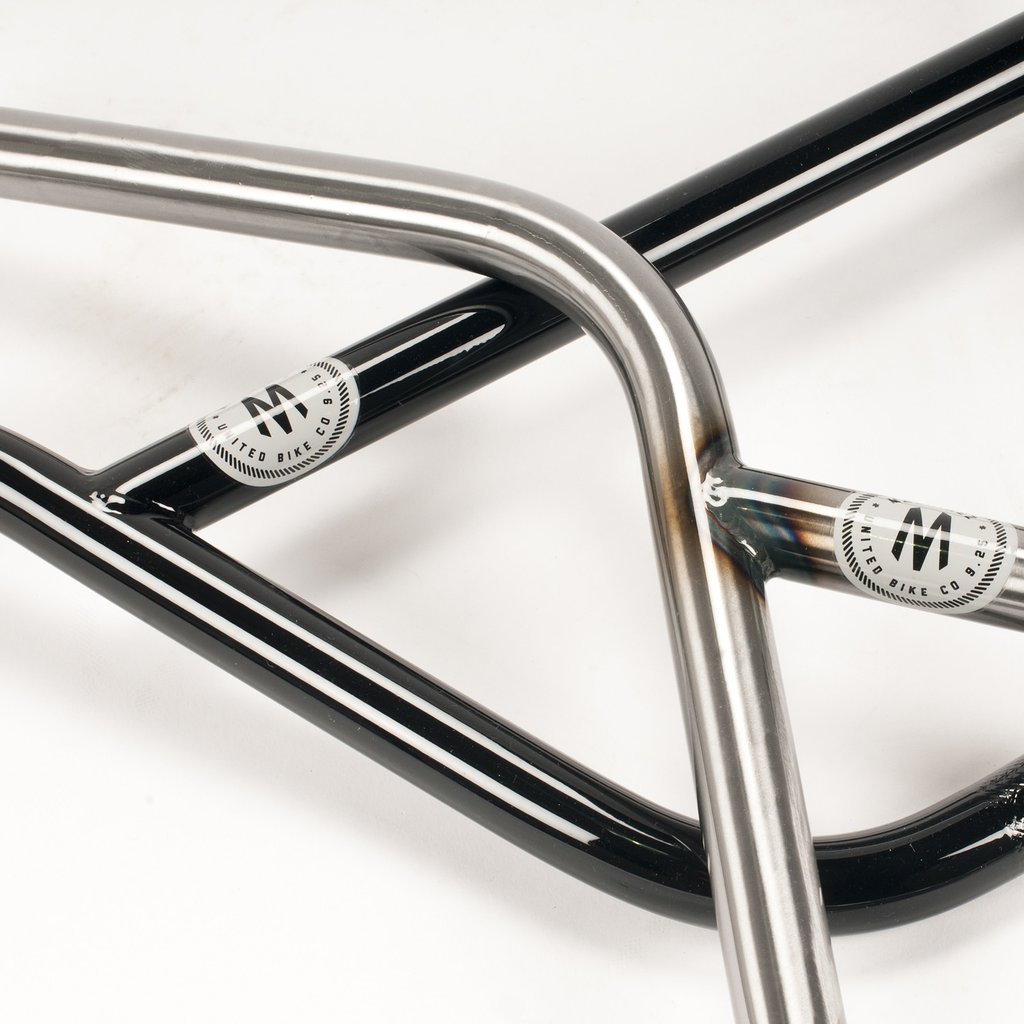 Guidão de BMX United Machinez 9,25″ verniz, assinatura do rider Corey Martinez, em Cr-Mo com tubos de parede de espessura variável e tratamento térmico.