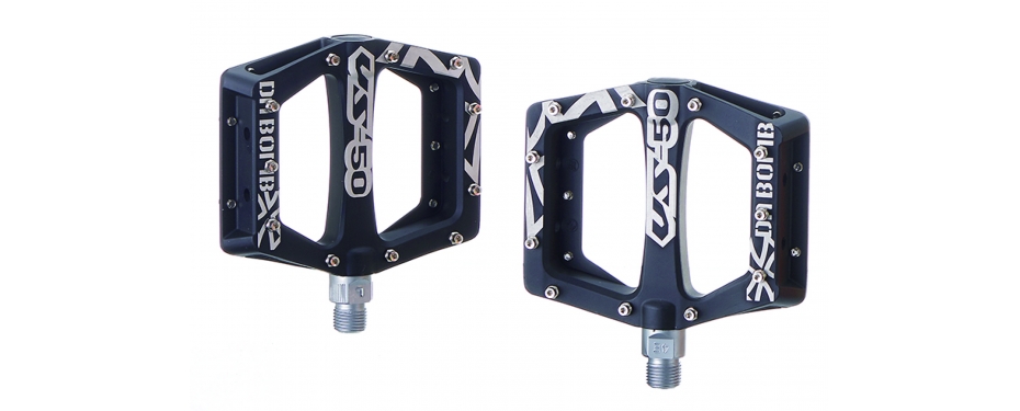 Pedal Da Bomb VS50 em alumínio injetado, c/ pinos removíveis e acompanha um kit sobressalente, eixo em Cr-Mo, plataforma de 111x108mm, espessura 17mm, sistema de esfera solta, peso 450g/par.