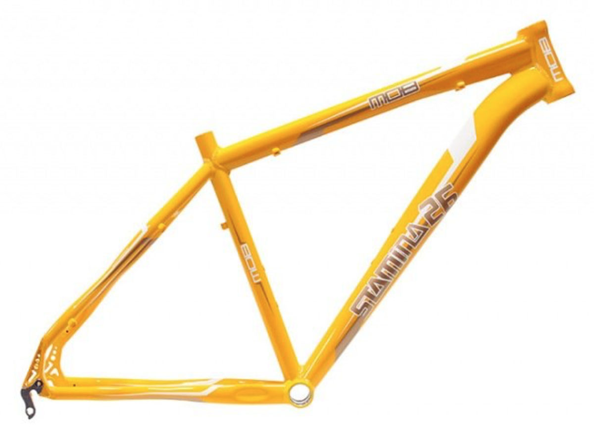 Quadro MOB Stamina 26″ amarelo, indicado para MTB iniciante com pivô de V-Brake e suporte para freio à disco.